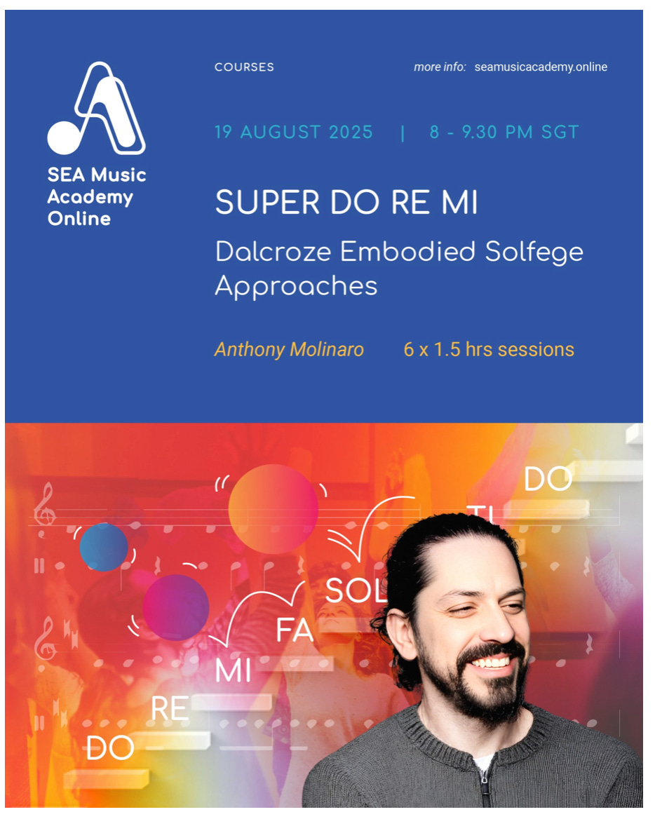I’m excited to announce an ONLINE COURSE available in the fall. This one is in conjunction with South East Asia Academy Online, and will be hosted by the Singapore based company. The course, however, will be available globally, so feel free to sign up! The class will meet in the morning (Eastern Time Zone) but will be available asynchronously. It will be all about SOLFÈGE and how movement can improve aural skills!