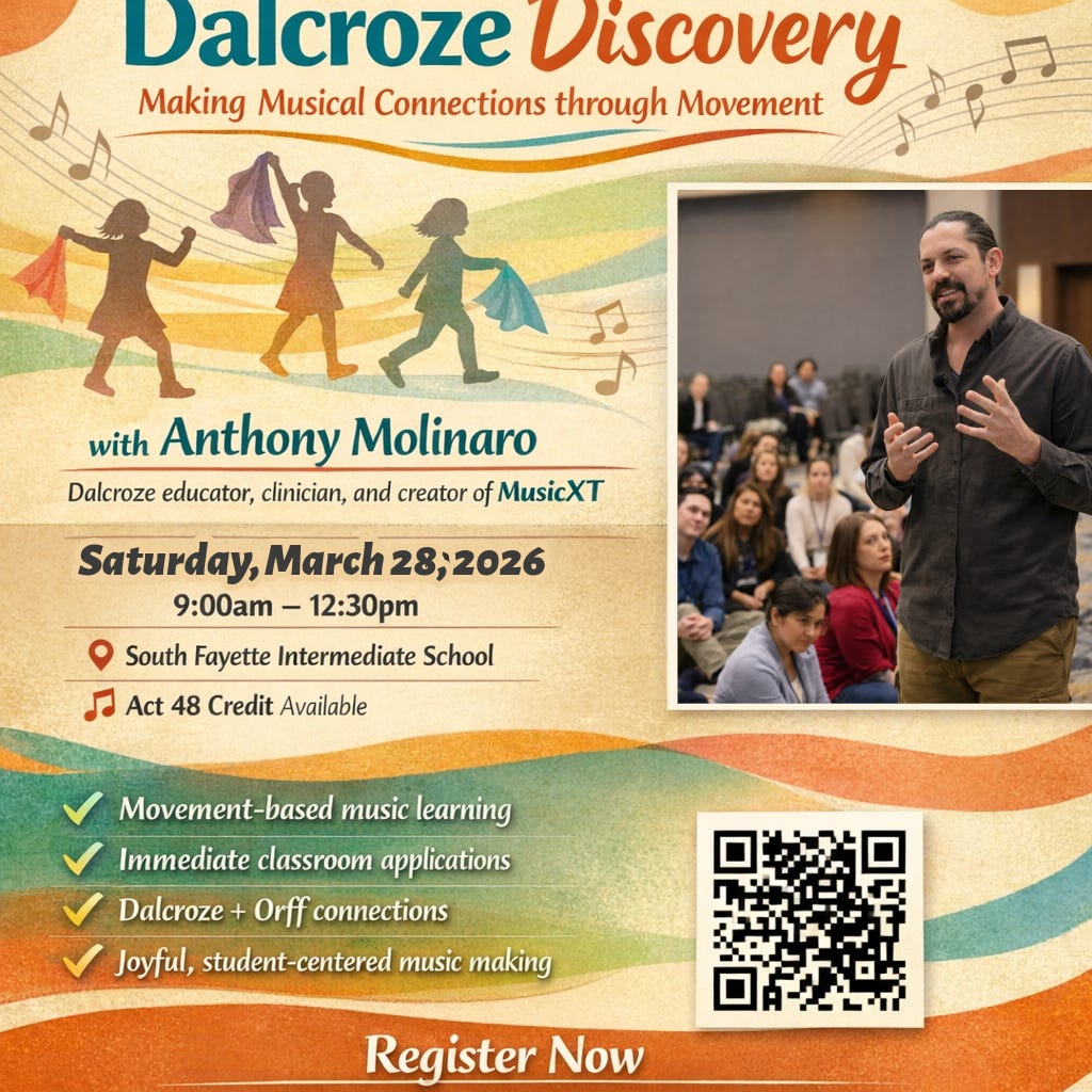 One of my strongest recollections of my childhood Eurhythmics classes involved stepping rhythms. Something about moving your whole body through space and time creates an unforgettable memory! The body WANTS to move in time. Harnessing this natural inclination to establish a “groove” with the body and WILL the feet to establish the groove of your intention is a primary goal of any Dalcroze practice. Managing weight and momentum makes rhythms feel more expressive and connects them to sensation, rather than simply to abstract ideas like “counting” or duration. If you’ve been following me for very long you know I have an aversion to counting music, and lately I have been making an effort to scrub my lessons of ANY numbers. In this post I’ll lay out a CLASSIC Dalcroze sequence that results in students performing a rhythm in a highly assessable format. But first: