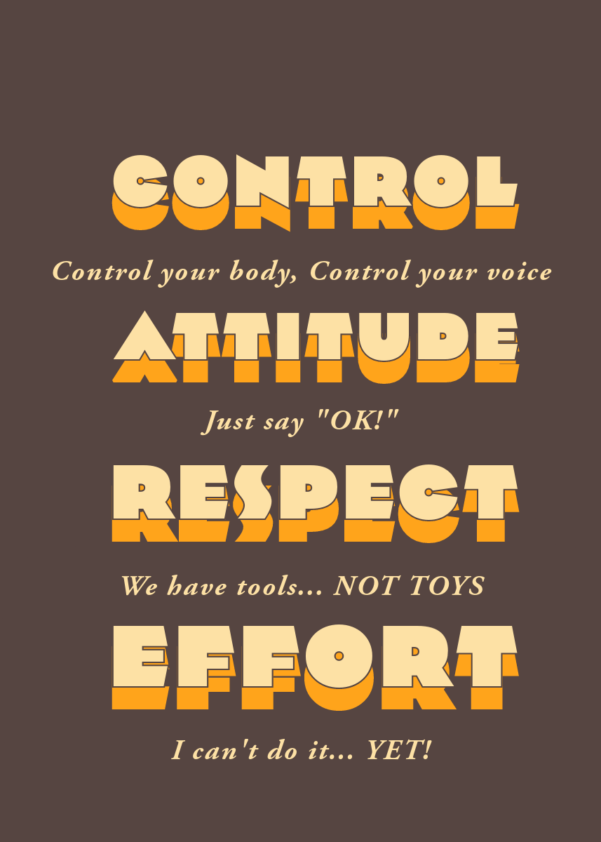 I only use four rules: Control, Attitude, Respect, and Effort. I attach each rule with a physical gesture and choral rhythmic response. I can use these responses later to remind children of the rules and also to redirect.